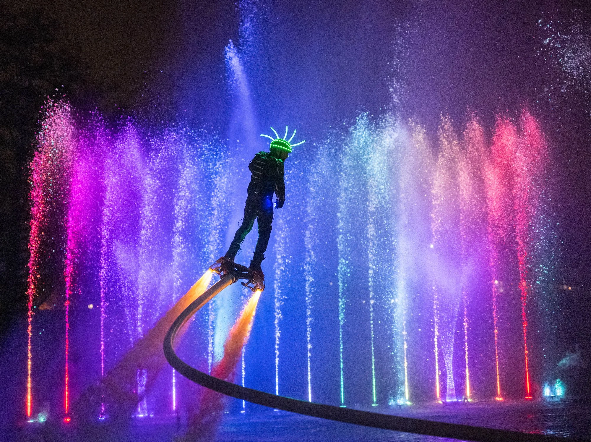 The portable Water Screen is an innovative solution where a curtain of water becomes a projection surface for videos, lights, and special effects even suitable for screening films. It offers a unique way to showcase logos, images, and motion graphics in a way youraudience will never forget. Choose a ready-made show from our catalog or create fully customized content. The WaterScreen is perfect for large audiences, whether it’s a festival, corporate event, or grandopening. Installation is flexible and can be completed as a one-day project always safelyand professionally.
